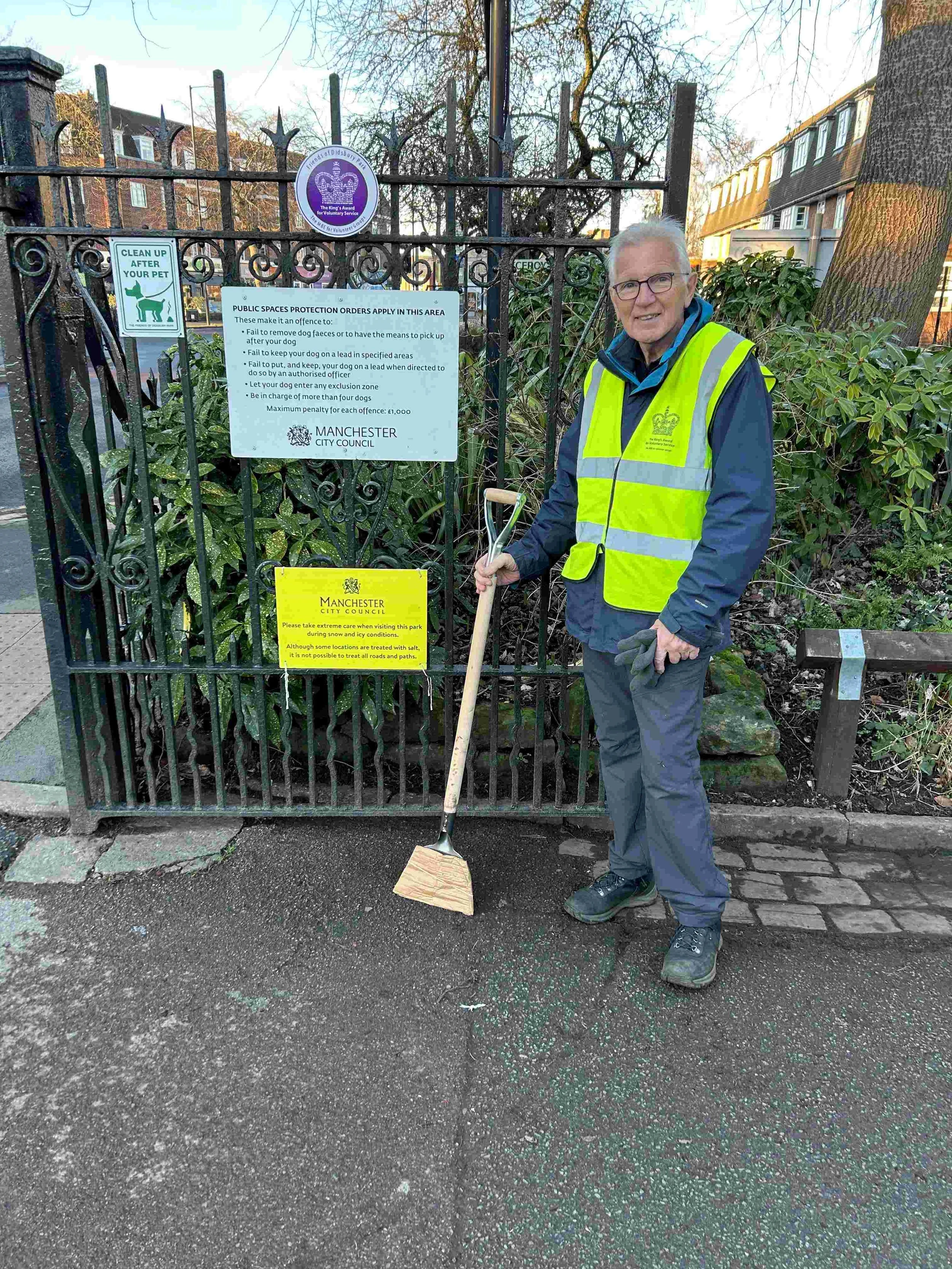 Picture 1 shows Allan posing in front of one of the Wilmslow Road park gates after he and I had fitted new King's Award for Voluntary Service plaques to both gates. Thanks to the generosity of Craig from Impact Signs we were provided with two new plaques to replace the previous ones which had been damaged by the large red rubbish bins from the cafe being bashed against the signs on the gates.