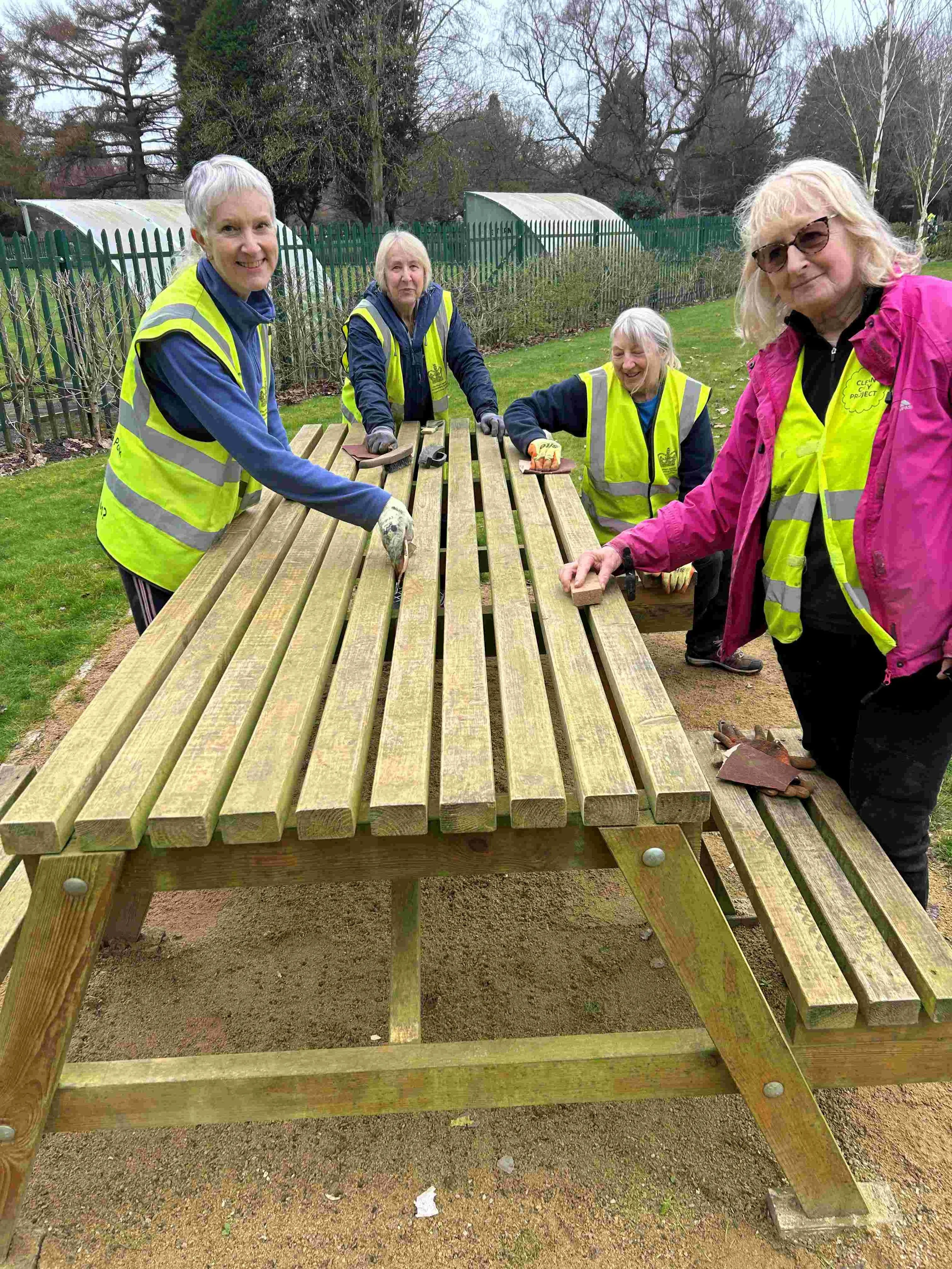 Last week Sandra and Lorna successfully painted a coat of preservative on one of the picnic benches last week. This week they co-opted Wendy and Lorna onto the team and set about the preservation of the other picnic bench on the wild flower meadow.