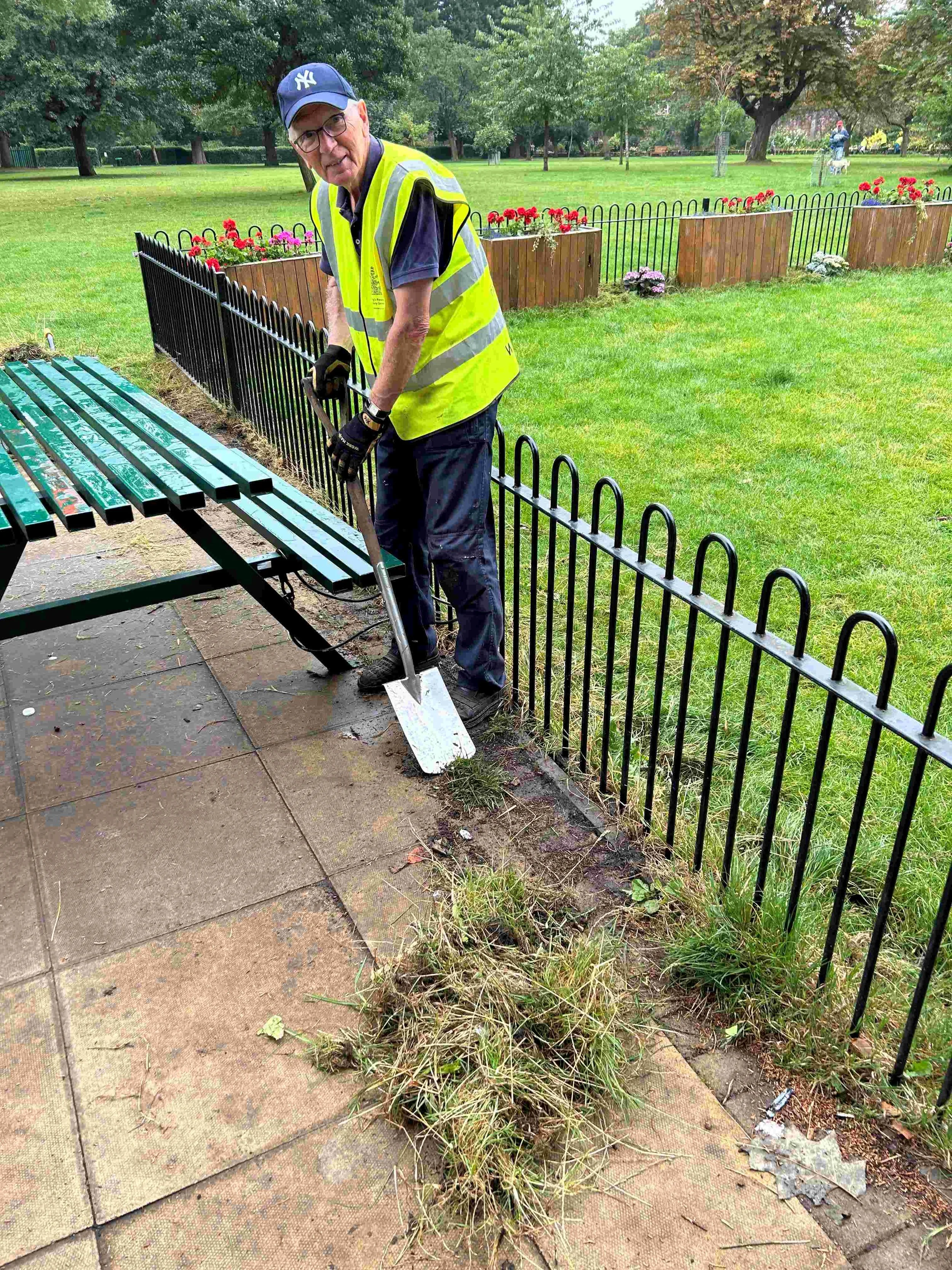 Especial thanks to Allan today, for coming to the rescue of the cafe garden, and employing the strimmer to cut back the overgrown grasses around the edges of the cafe garden. Picture 7 shows Allan tidying up some stubborn pieces of grass on the patio side of the cafe garden railings. Thank you Allan.