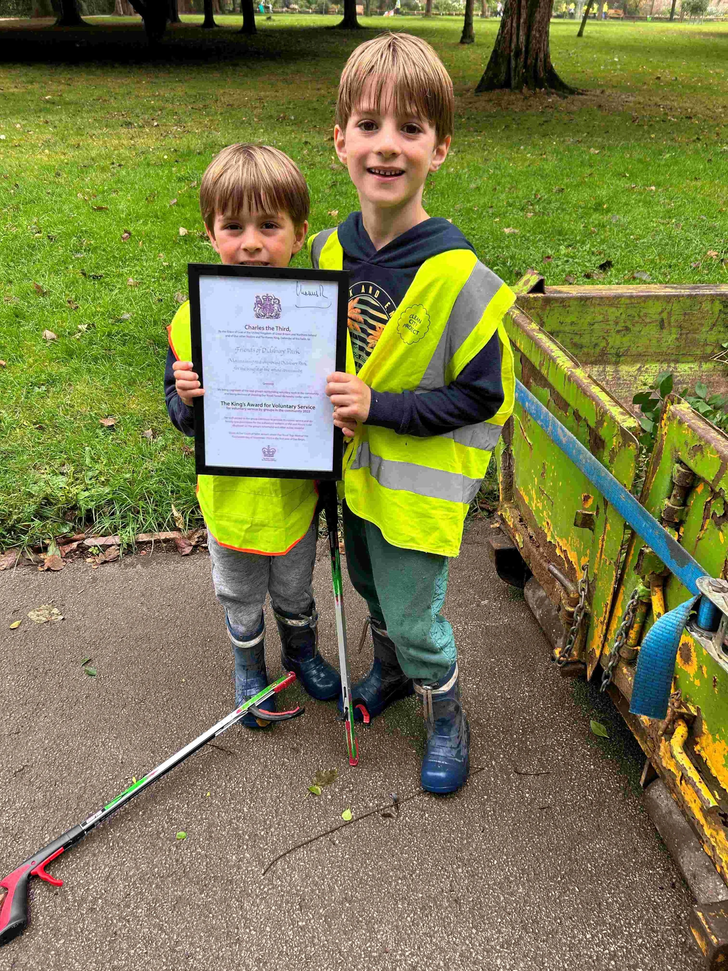 Picture 1 shows Sebastian and Alexander, taking a break from litter picking, to proudly hold our certificate for the King's Award for Voluntary Service. They were particularly impressed that it had actually been signed by King Charles the Third. Our other family was Joanna and her son, also called Alexander. Both families did a super litter pick, for hours across the whole park. Thank you - we will miss you next week when you are back at school!