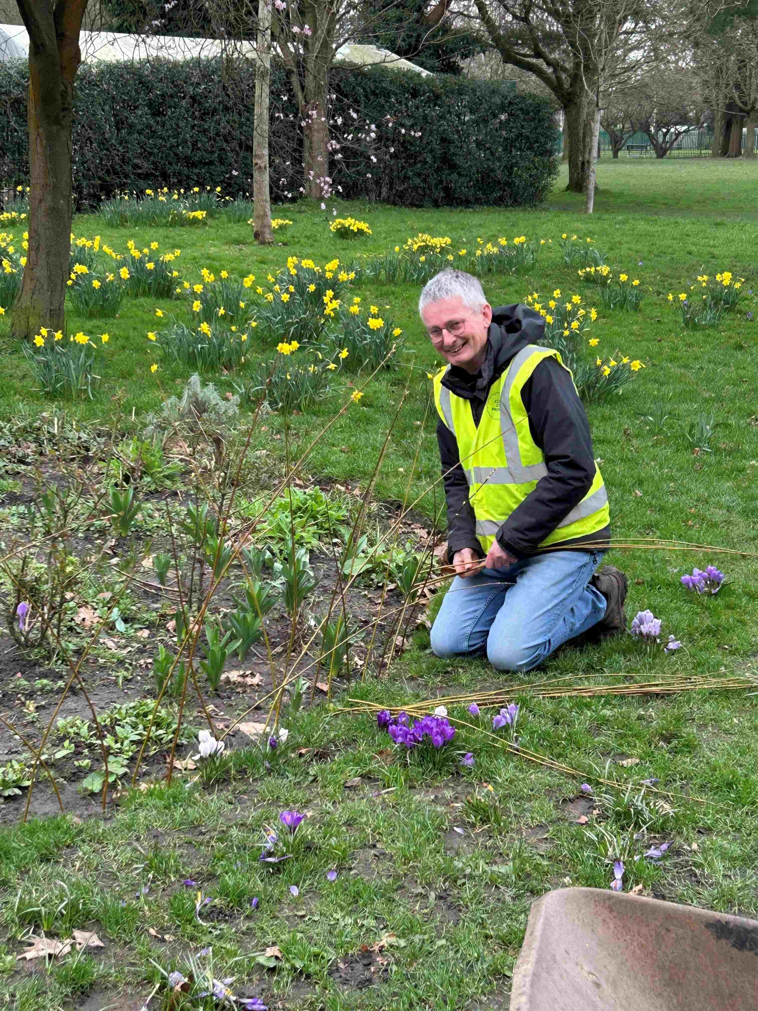 Picture 9 shows Kevin in a beautiful setting, surrounded by daffodils and crocuses, as he applied his skills to the construction of a new low natural fence around this flower bed. Excellent work Kevin - thank you!