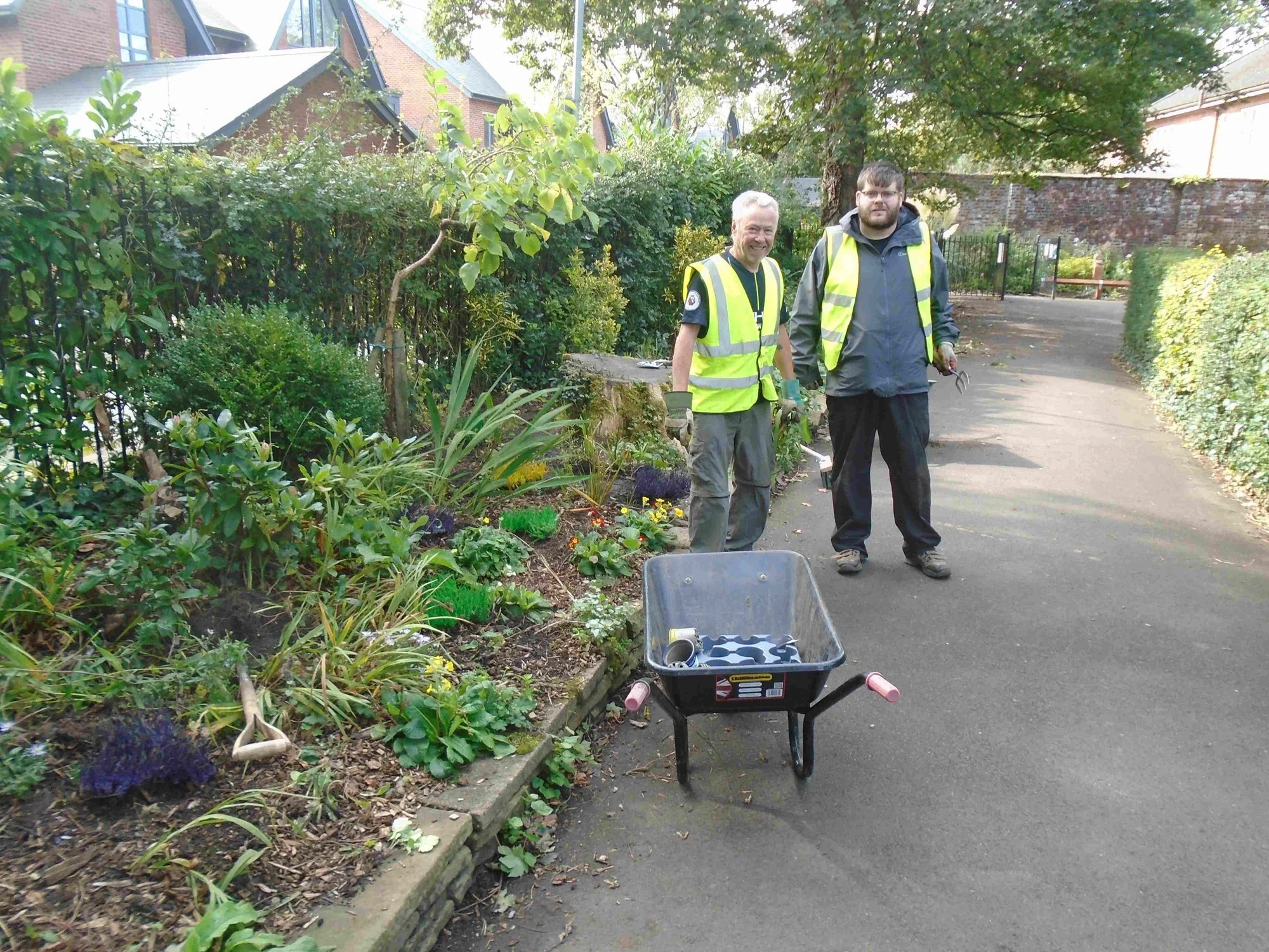 The Gillbrook Road entrance team of Brenda, David and Allan were also supplemented today by Tony, our Park Ranger. Brenda, David and Allan cleared up all the paths from the Didsbury Neighbourhood Centre to the roundabout and Tony did some running path repairs on deteriorating paving around the entrance gate. Thank you all. This area looked great by the end of the morning. Picture 5 shows David, Brenda and Tony posing for a picture by the Gillbrook Road gate.