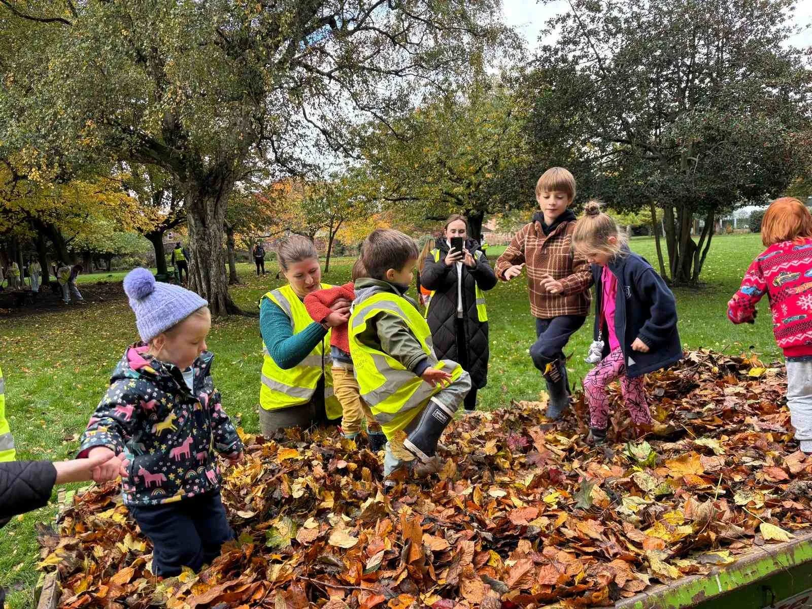 Picture 2 (approved by the parents) shows some of the younger children having a great time compacting the leaves in the skip!
