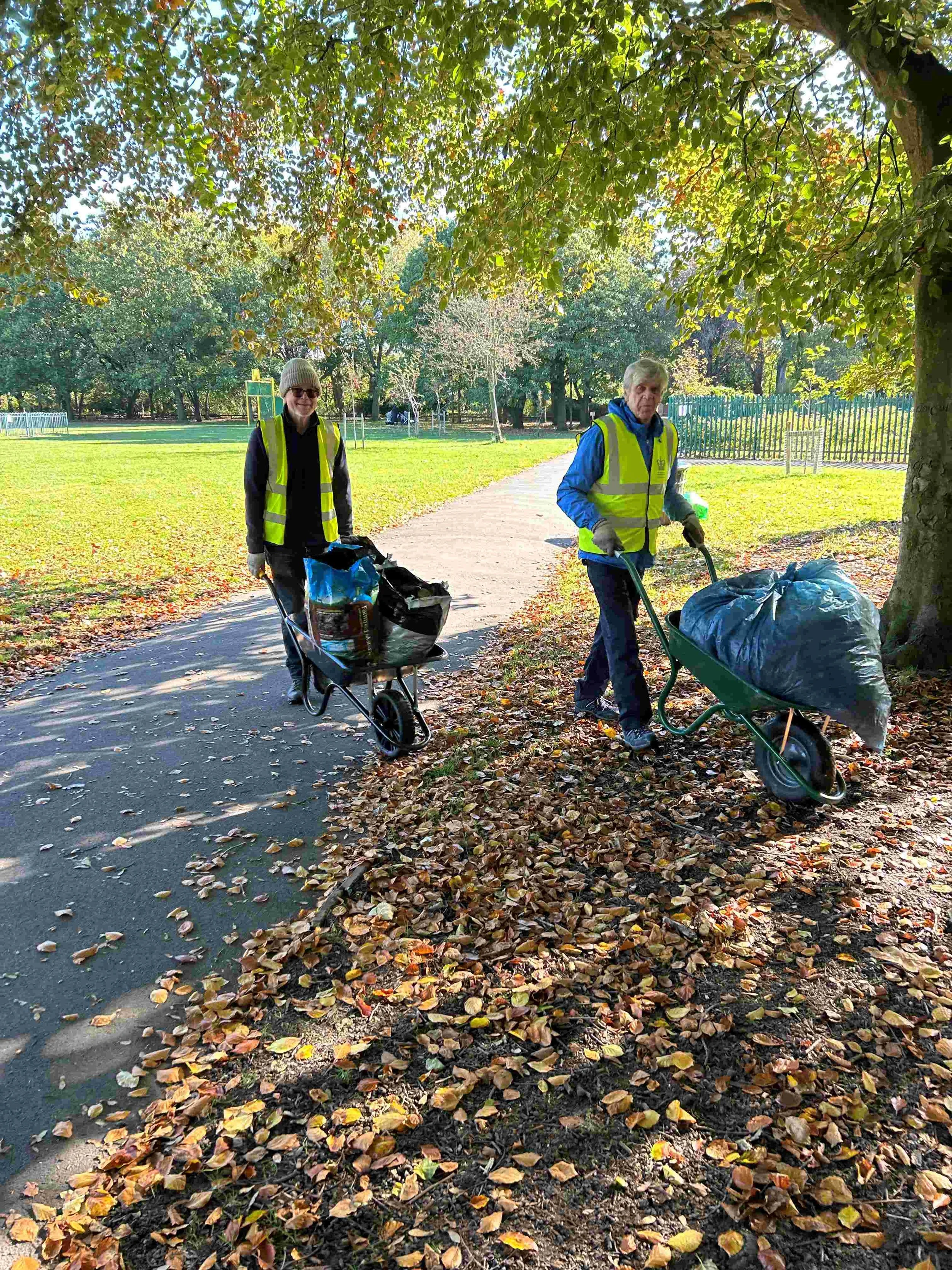 Many pictures were taken of people clearing leaves today but the one which made the cut was Picture 10 showing Steve and Gary with wheelbarrows containing old plastic bags full of leaves. The use of plastic bags is part of an experiment to speed up the decomposition process to produce some good quality mulch. Fingers crossed. 🤞 A huge thank you to everyone who helped clear leaves today.