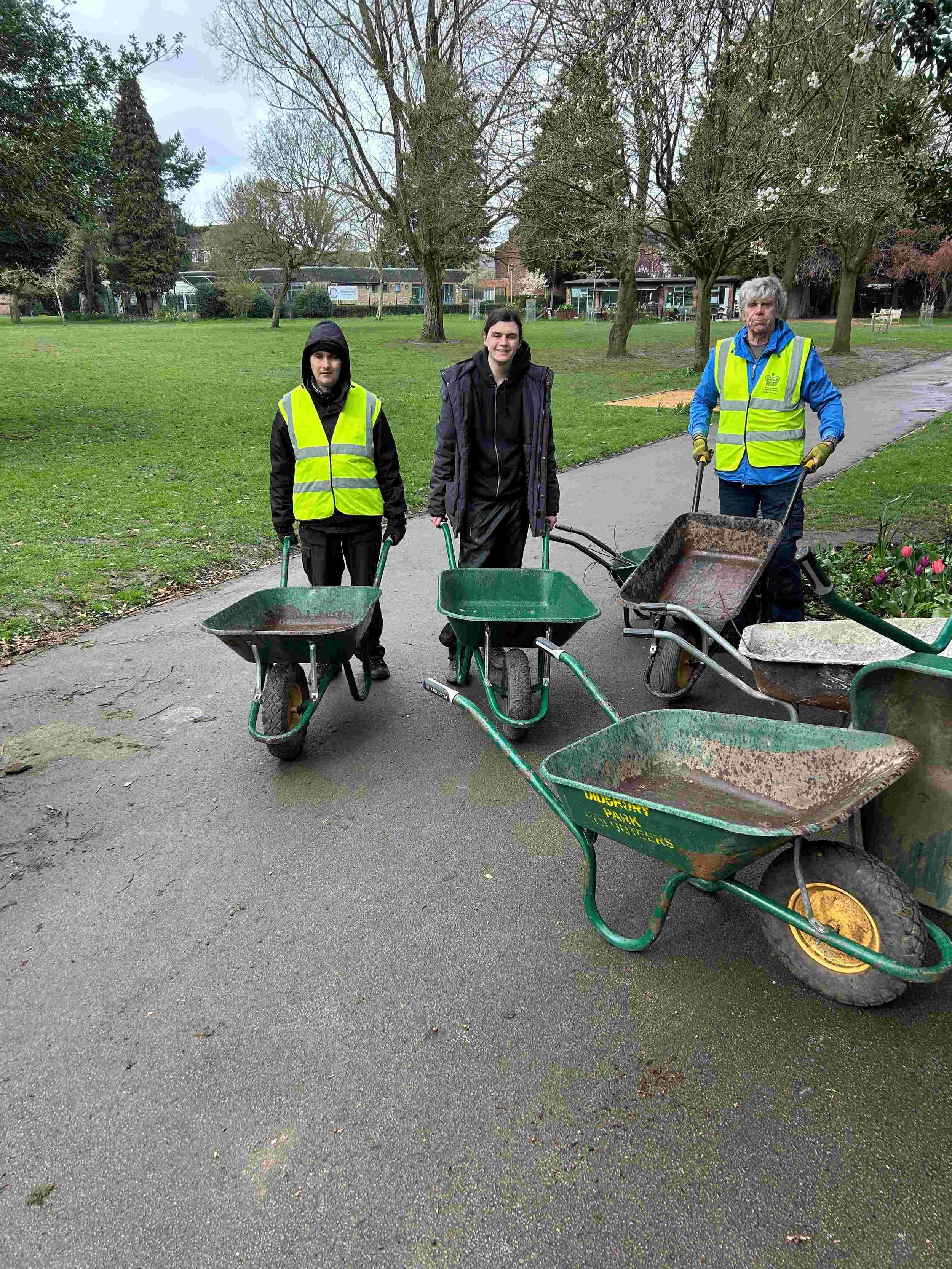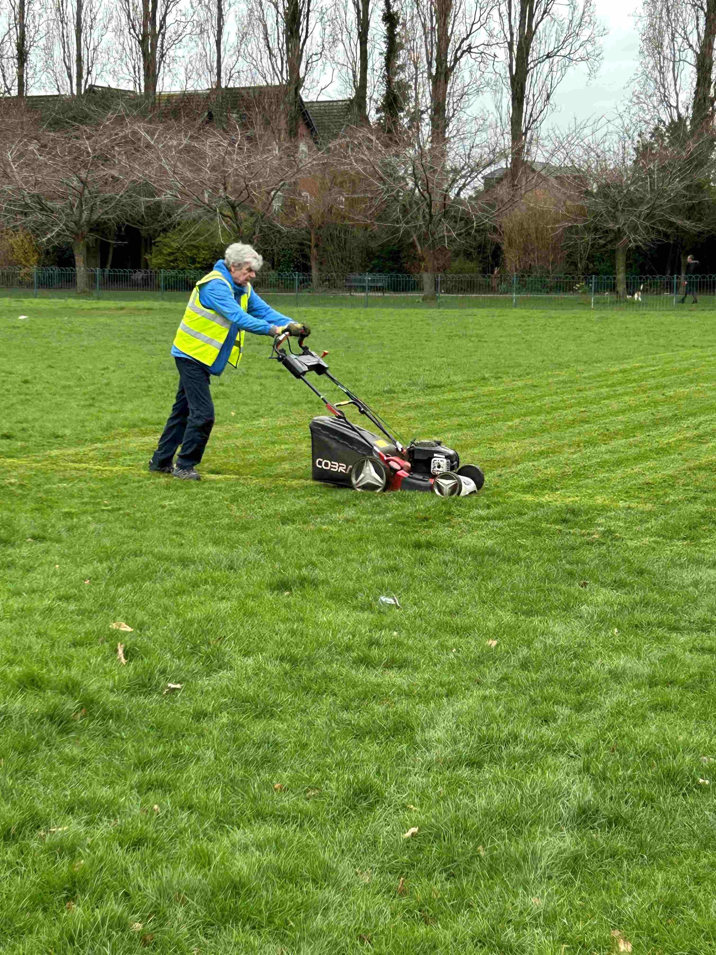 Following the unavoidable last-minute cancellation of our volunteers from business this morning, combined with a bitterly cold wind and intermittent ice-cold, wet downpours, we did really well to have an amazing attendance of 37 volunteers in the park this morning. We once again welcomed our SEN students and staff from Brentwood College and Roger Morris from MCC who provided another informative and interesting course on lawn mowers to Joyce, Gary and myself.