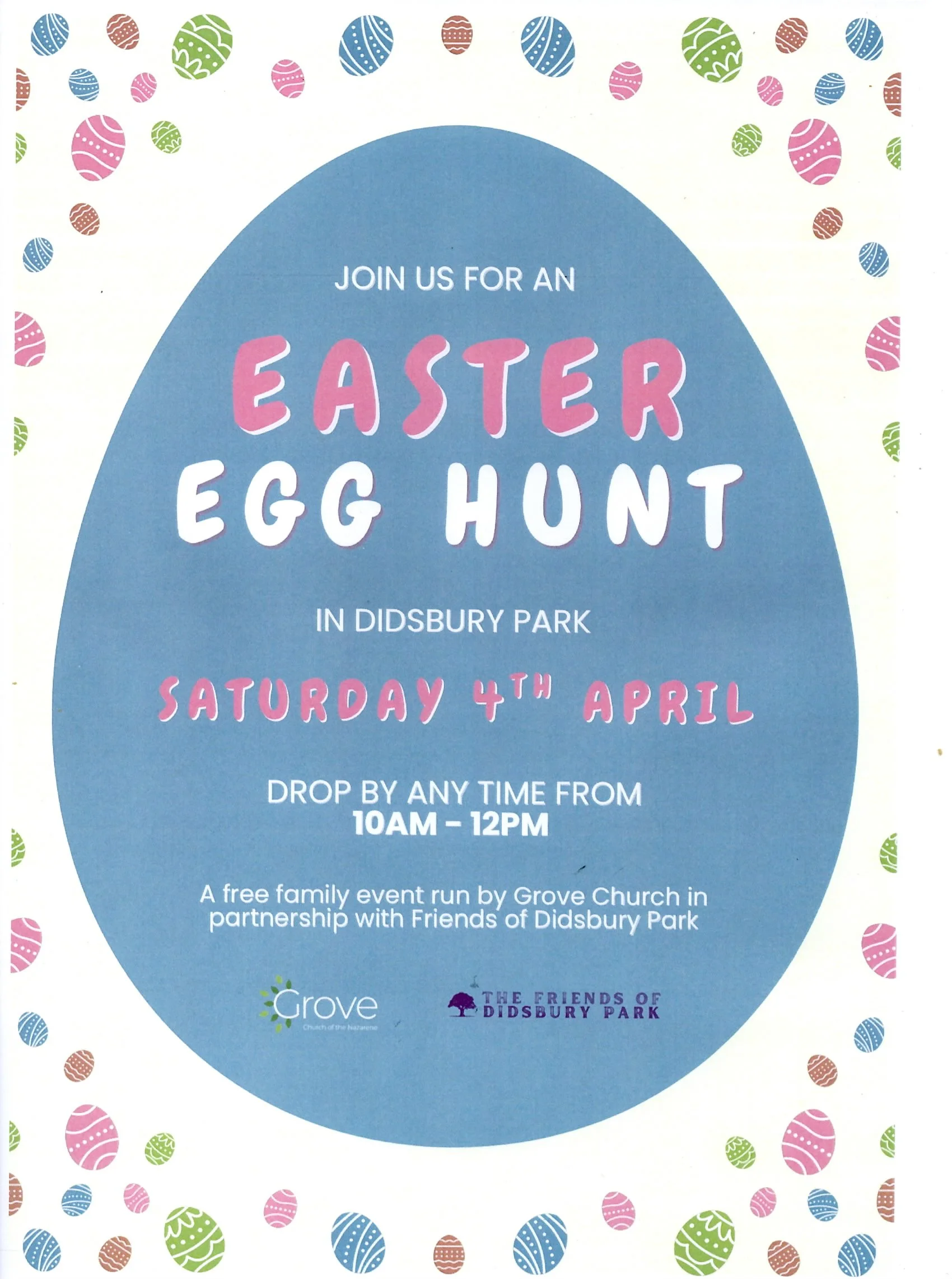EASTER EGG HUNT: It is traditional for us to hold an Easter Egg Hunt for the young primary school children in the park every year at Easter. This year is no exception. Thanks to the generosity of the Grove Church this is a free event. It is organised by members of Grove Church and supported by the Friends of Didsbury Park. If you do have any young children, or grandchildren please do bring them along on Saturday. I have attached a poster as picture 1 which explains the details of the event and states that it will be open between 10am and 12pm.