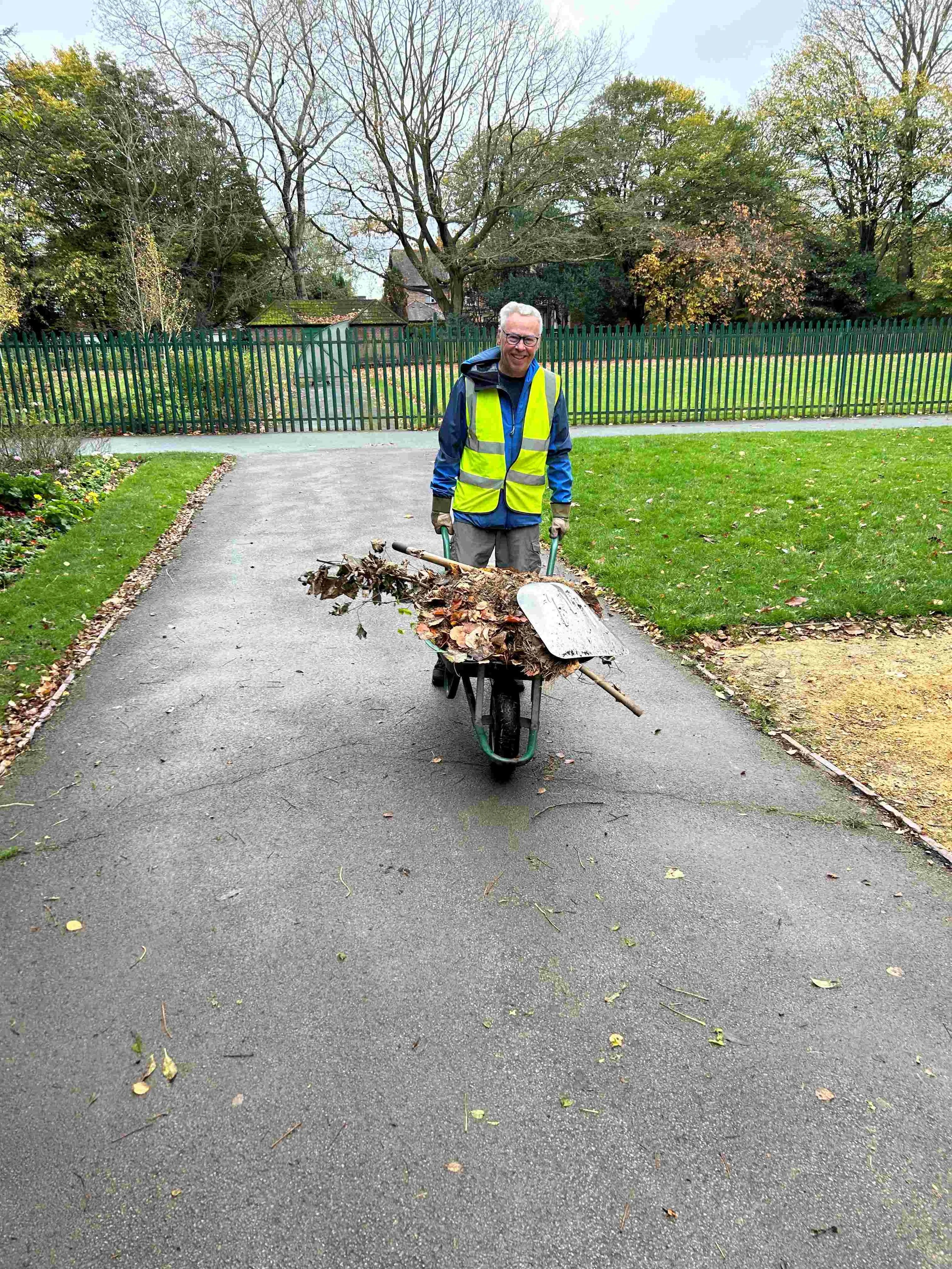 Once again we have had a significant fall of autumn leaves this week. As a result of this leaf fall plus some significant rain during the last few days, some of our paths have become quite slippy. Consequently we divided the remaining volunteers from business into 2 teams of circa 4 people each and led by Allan they cleaned up all the leaves near the Sandhurst Road pedestrian entrance, around the roundabout, near the Gillbrook Road entrance and along the path to the Wilmslow Road gate. This was a major piece of work.
