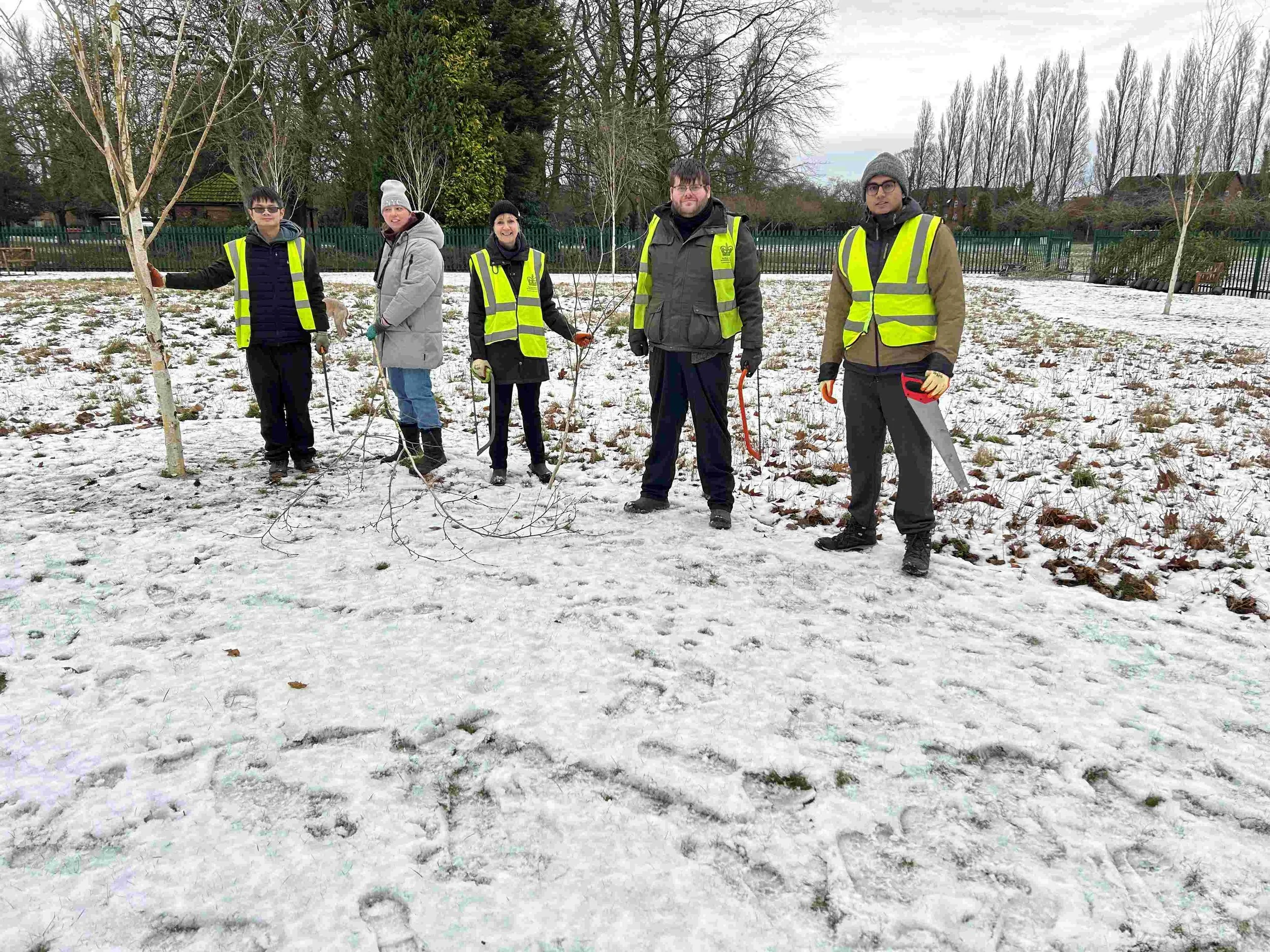 Picture 6 shows John, Grace, Christine, Tristan and Shashvat working on the snow covered wild flower meadow where they gently lifted the low canopy on each of the 10 Himalayan birch trees. This was a well timed piece of seasonal pruning which will expose the beautiful white trunks of these trees and make them look even more stunning. Greg then gave a helping hand and used the pruned branches in his work creating a natural hedge. Thank you all - this was a great piece of work.