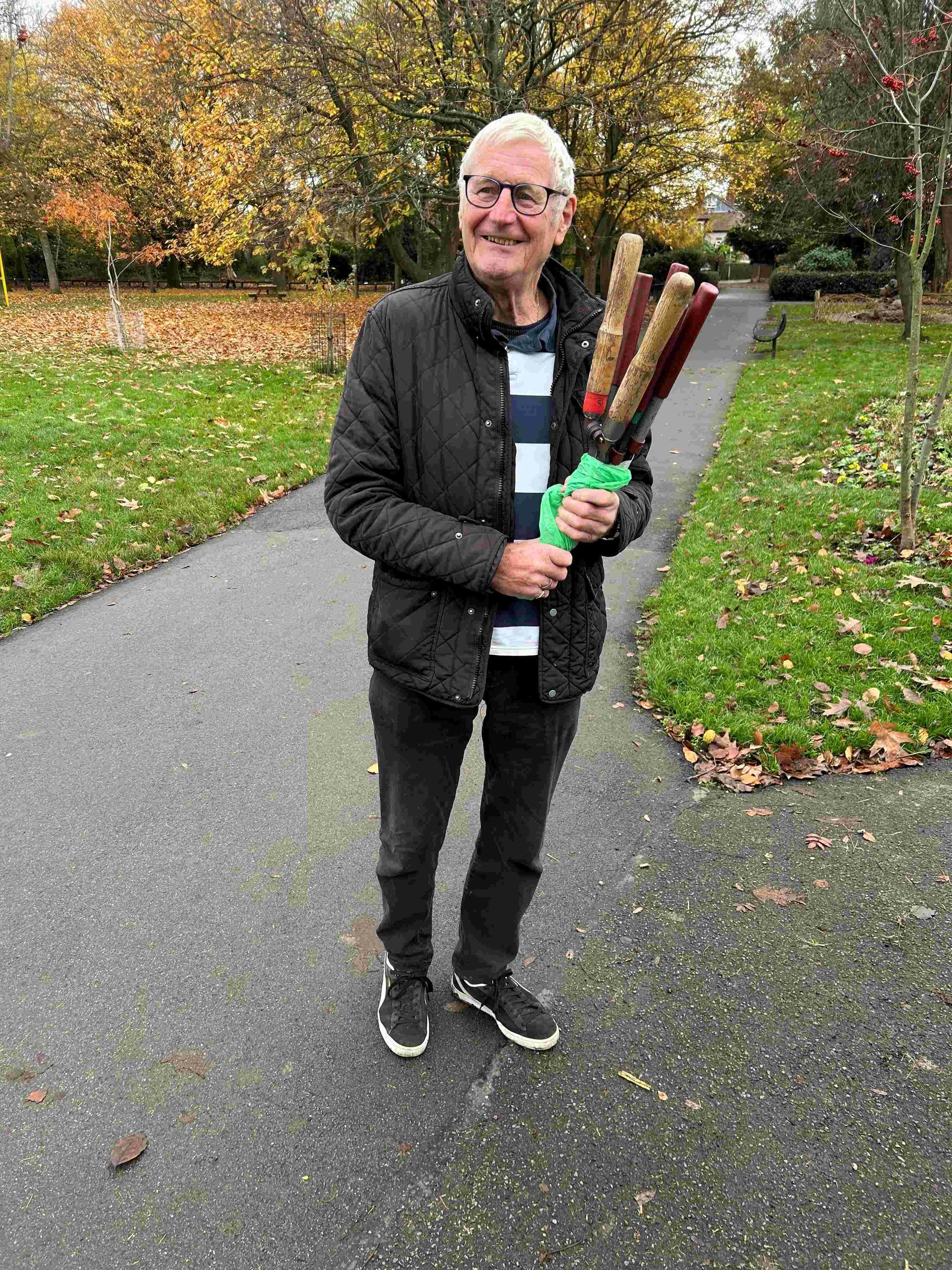PIcture 10 shows Tony who joined us for the first time today and immediately offered to sharpen some of our shears. This picture shows Tony returning with three shears ready to go another round for the volunteers! Thank you Tony and welcome to the team.
