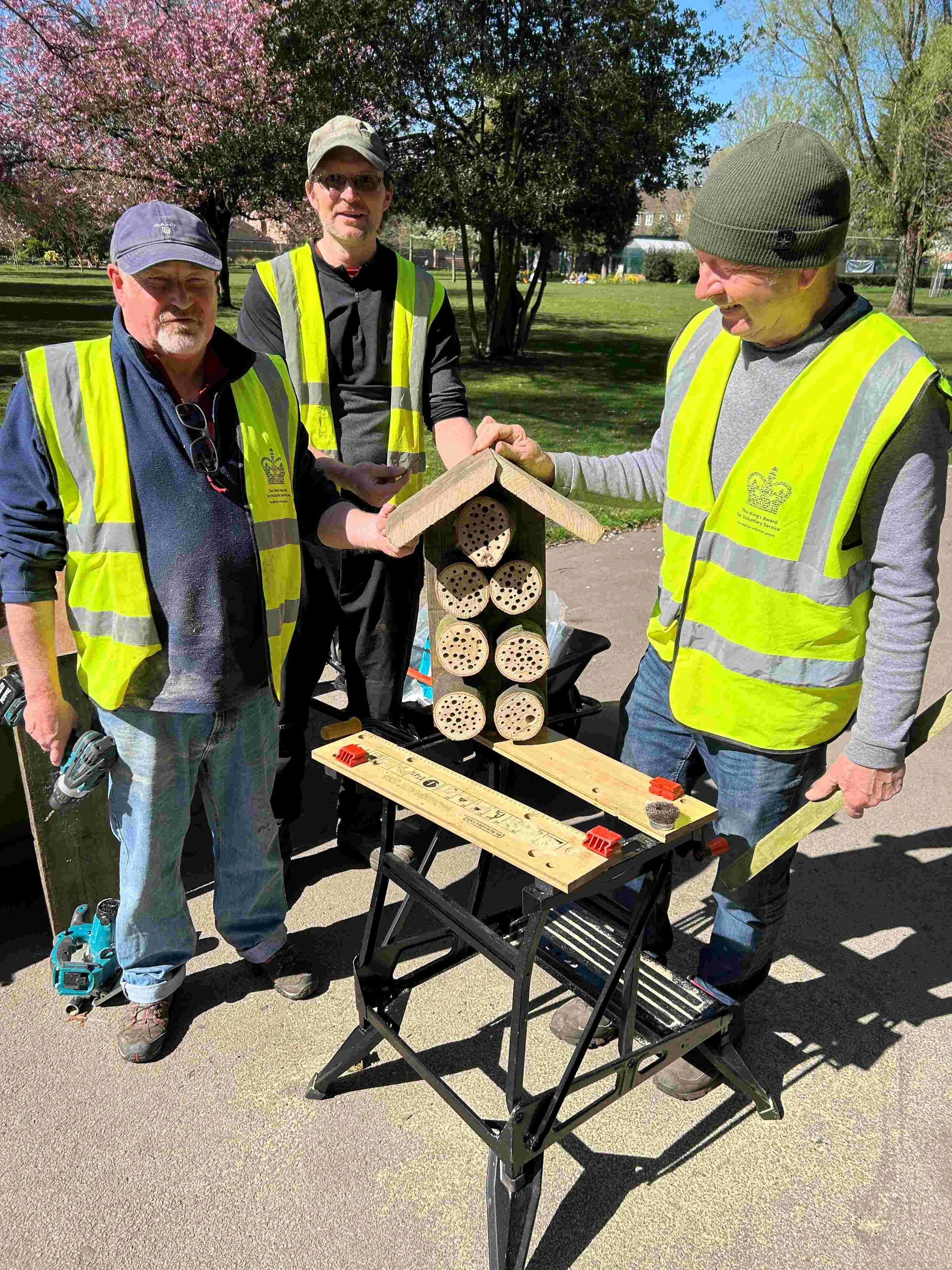 As a side project Picture 5 shows some of the creative side of our volunteers as Murray, Carl N and Greg show the amazing nesting box for insects which they designed and built before installing it in the woodland area. Thank you guys - ingenious! We are all thrilled that this year, for the first time ever, we have witnessed bees now using the nesting boxes on the side of the volunteers shelter. One up for Didsbury Park Conservation!