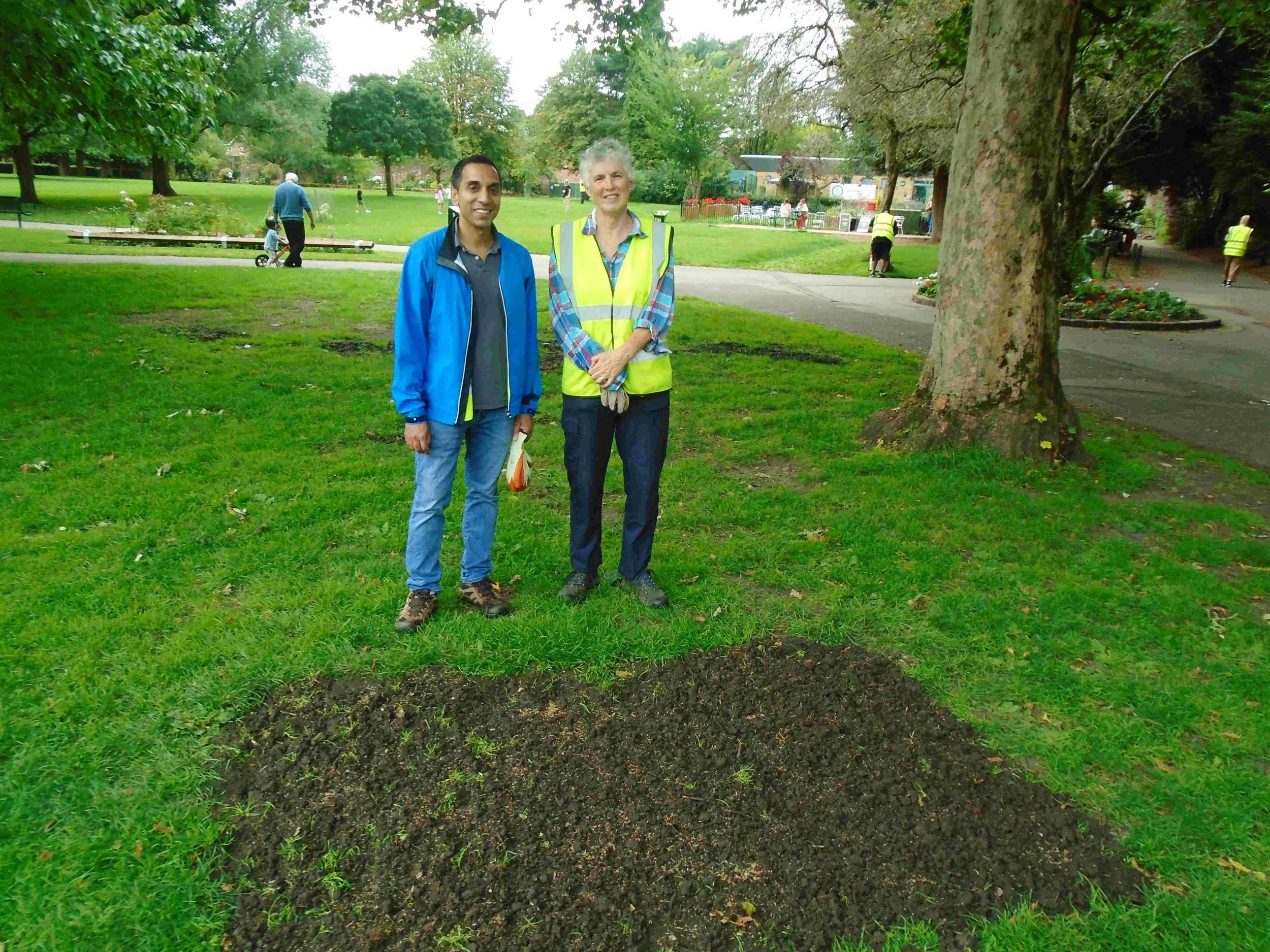 Picture 10 shows Anne with Suborno, instead of Marie-Claude, for no other reason than it was taken after Marie-Claude had just left the park and Anne happened to be passing. Thank you Marie-Claude and Suborno for working so hard to prepare and sow this area. Incidentally, in the background of picture 10 you can see one of the NatWest volunteers mowing the newly repaired area leading to the cafe. Great results all around.